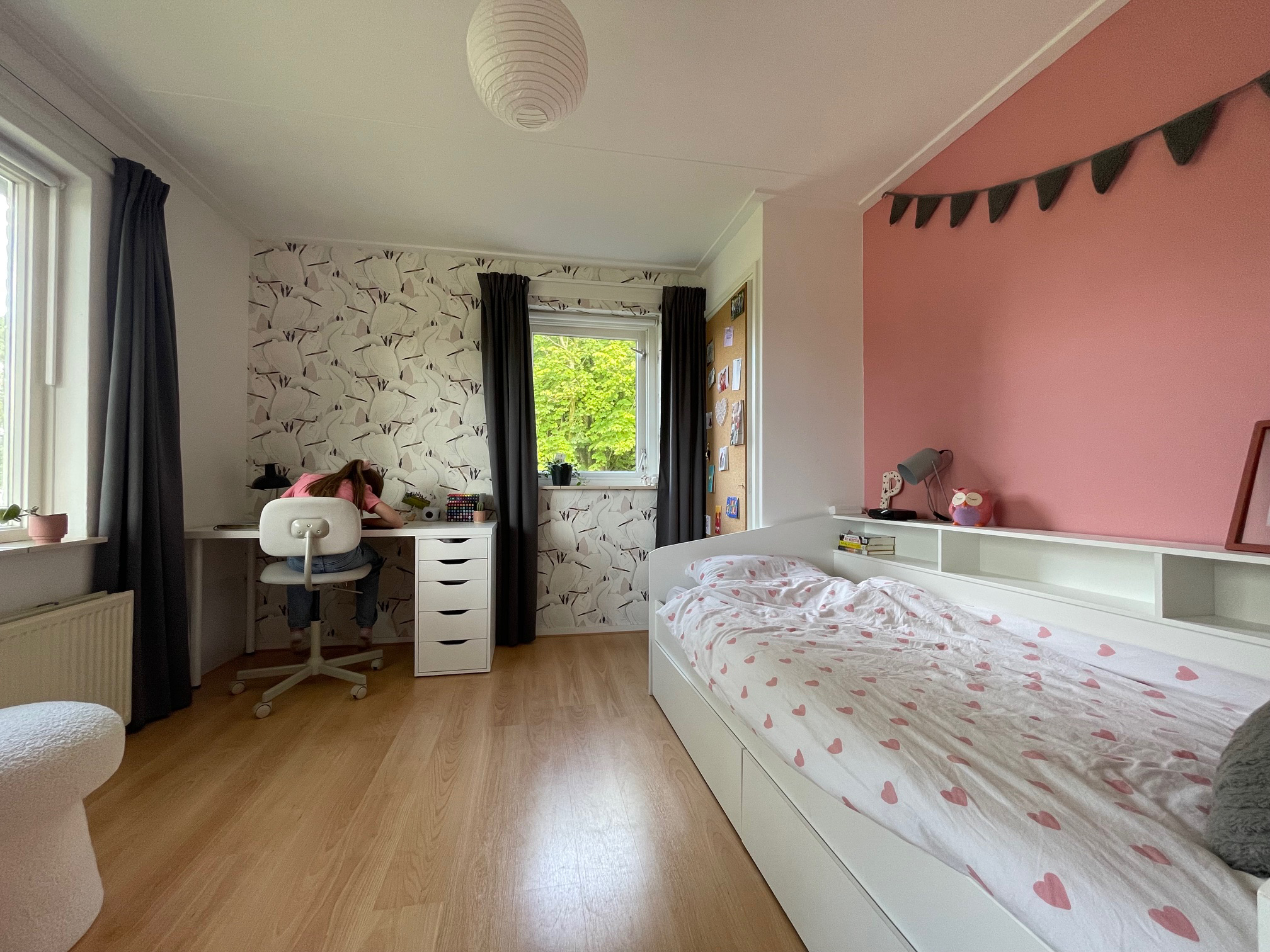 Het ontwerp is volledig afgestemd op de behoeften en wensen van de tiener. De combinatie van natuurlijke materialen en zachte kleuren zorgt voor een warme en gezellige sfeer. De speelse elementen zoals het kraanvogelbehang en de rotan decoraties prikkelen de fantasie en creativiteit.