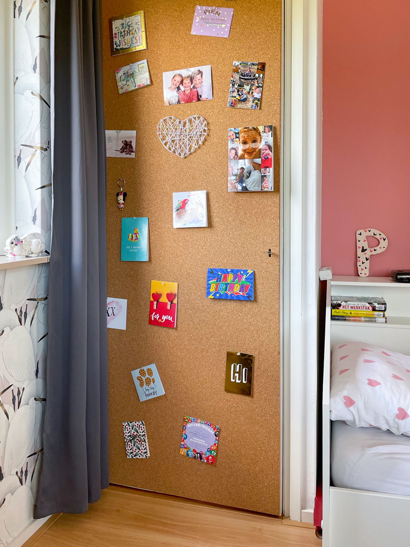 Naast het esthetische aspect is de kamer ook zeer functioneel ingericht. De kurk wand creëert ruimte voor eigen creativiteit, terwijl de multifunctionele bouclé poef een comfortabele plek biedt om te ontspannen of te lezen.