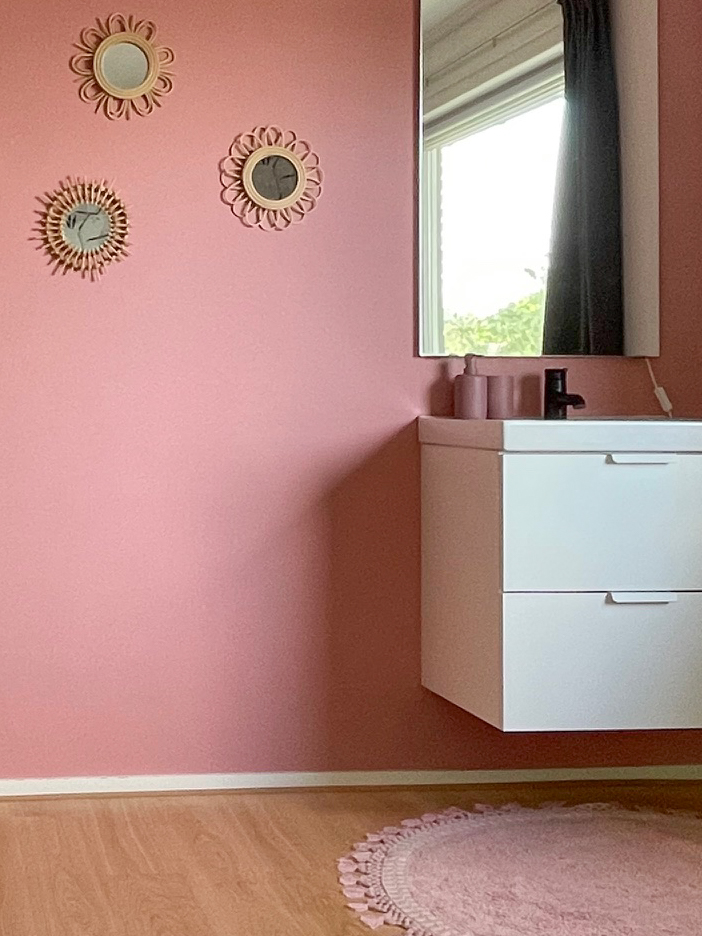 Een zacht en warm kleurenschema met lichtroze en natuurlijke tinten, die een rustgevende en uitnodigende sfeer creëren.