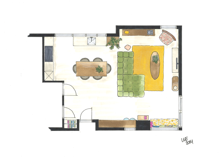 De bewoners gaven aan erg van kleur te houden, maar dit kwam nergens naar voren, behalve in de blauwe muur in de keuken. Ook werd de prachtige natuur buiten nauwelijks naar binnen gehaald. Het was tijd om kleur en natuur in het interieur te brengen!