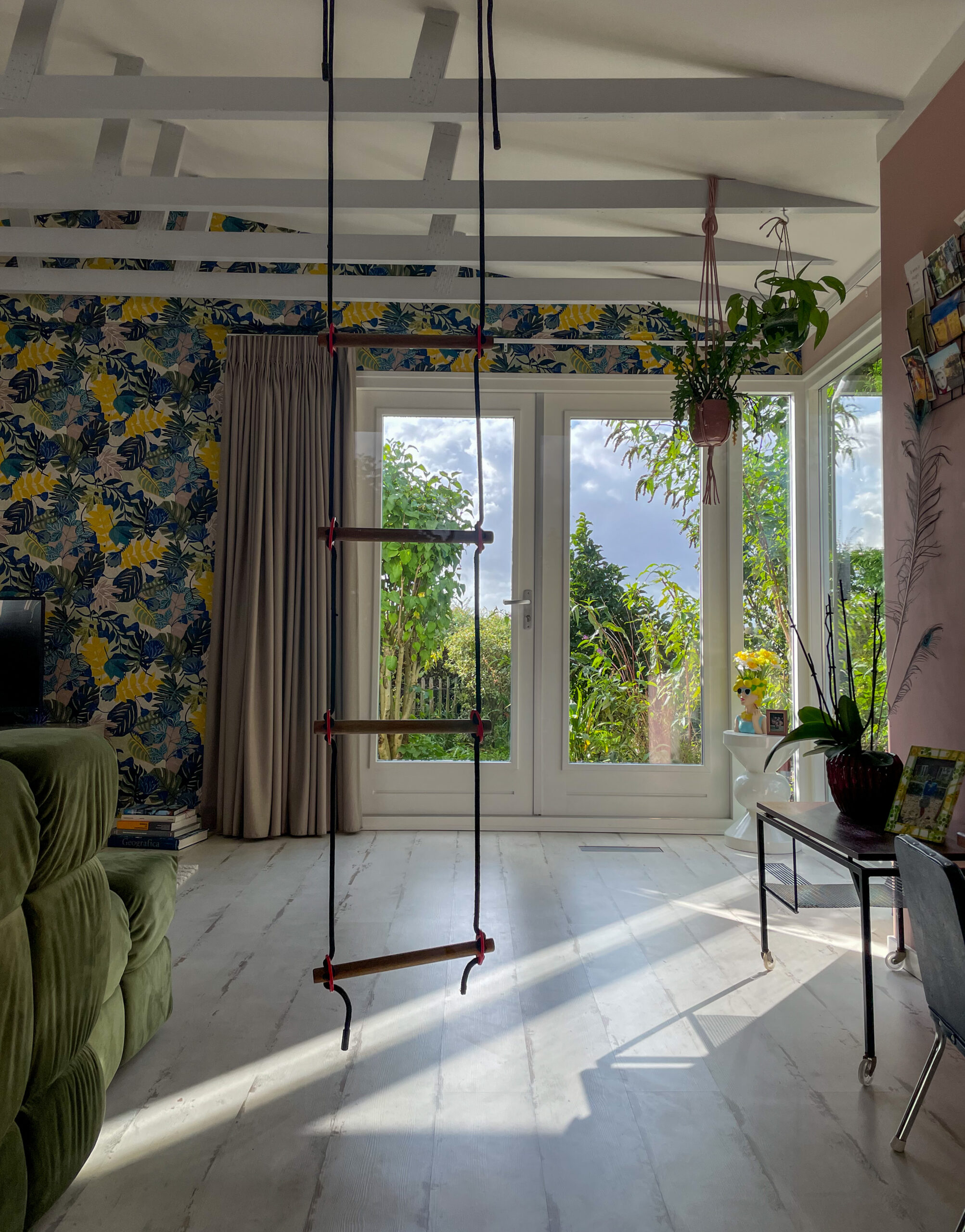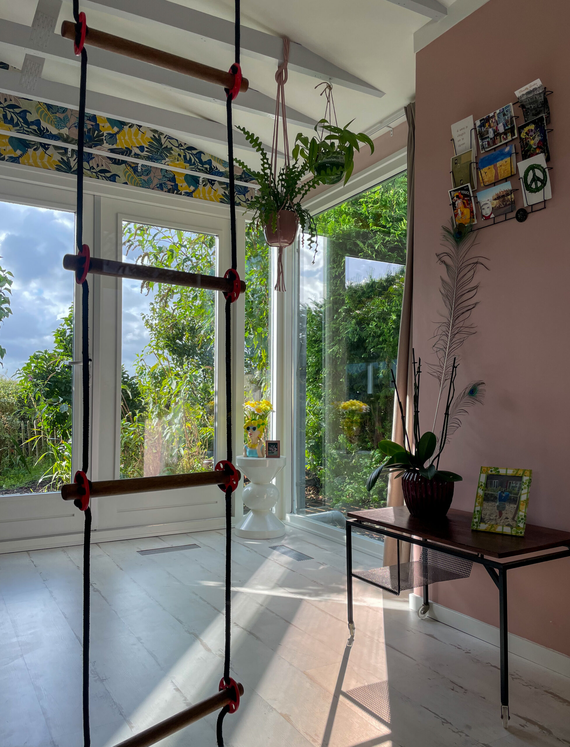 Een aantal rotte kozijnen zijn vervangen door grotere ramen en openslaande deuren, waardoor er meer contact met de natuur ontstaat. De meubels zijn zo gepositioneerd dat er optimaal zicht is naar buiten. Er is een comfortabele leesplek gecreëerd en de kinderen hebben hun eigen plek om te knutselen en zelfs om te klimmen.