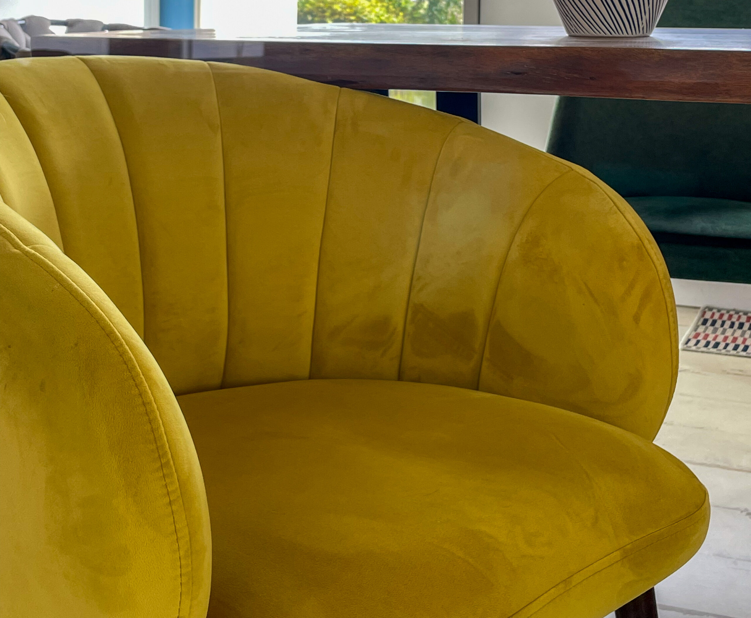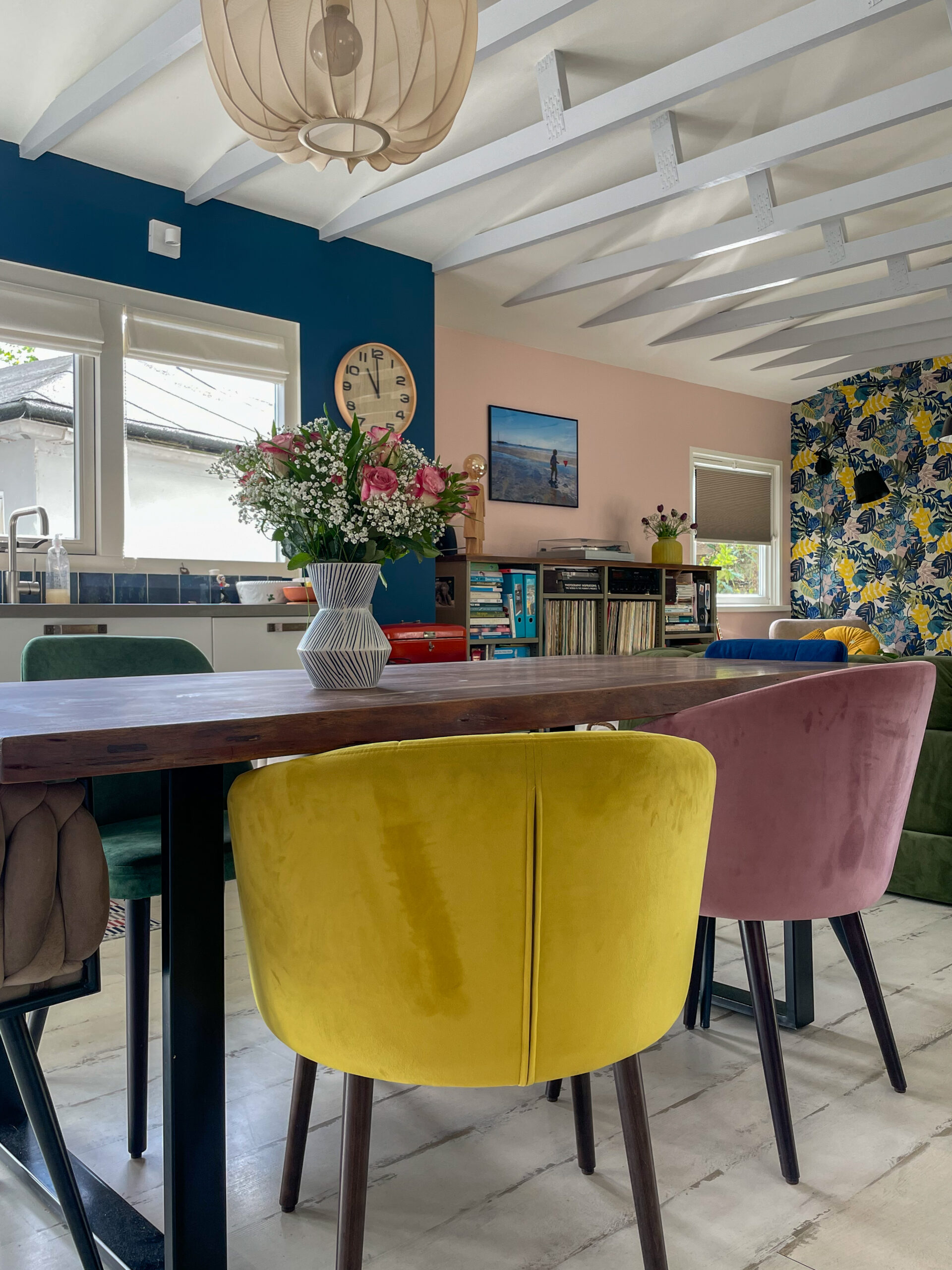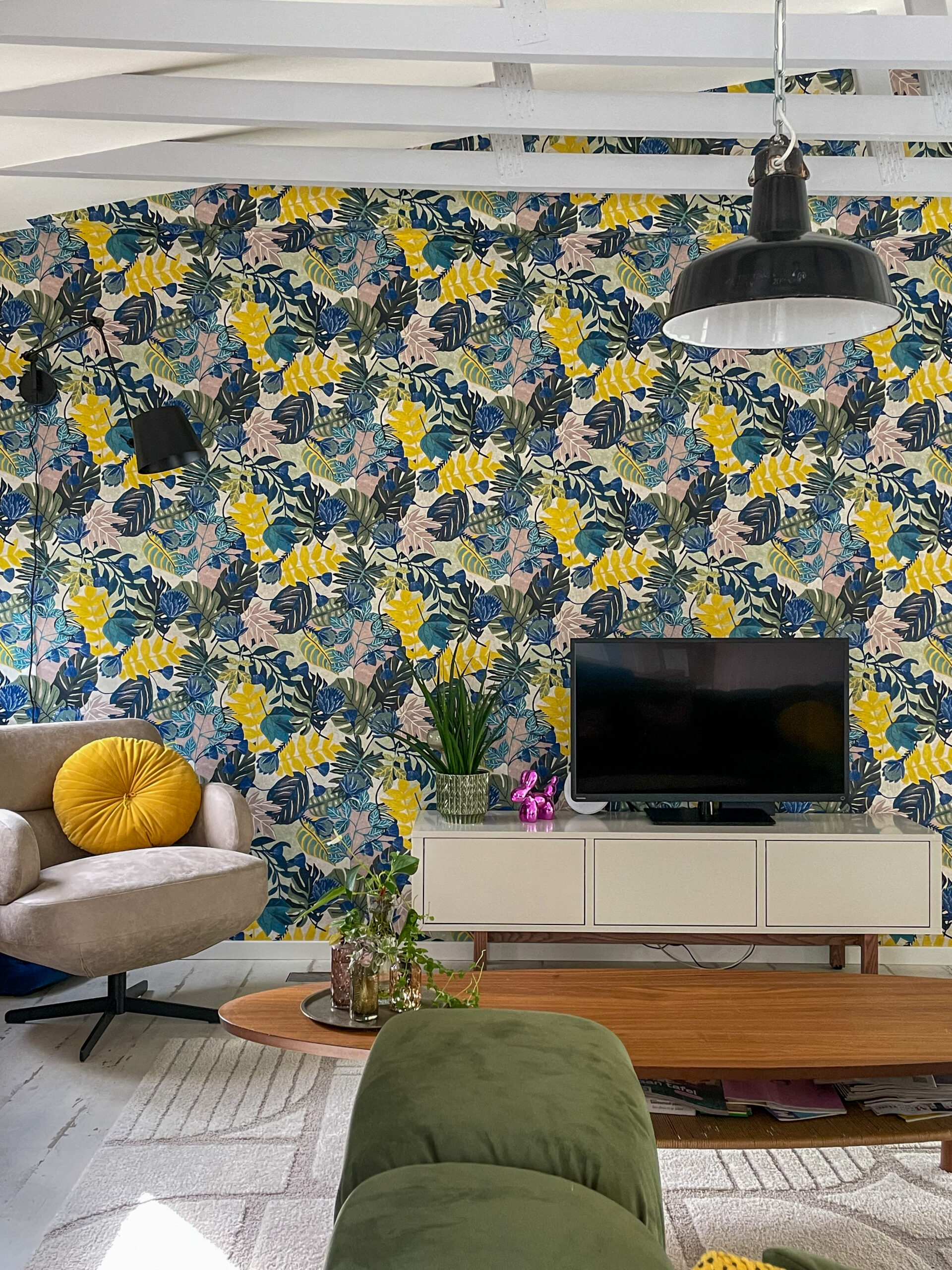Het kleurrijke behang en de diversiteit aan stoffen zorgen samen met de meubels voor een heerlijke retro sfeer. De sfeer waar de bewoners diep van binnen van houden, maar die amper tot uiting kwam in hun oude interieur.