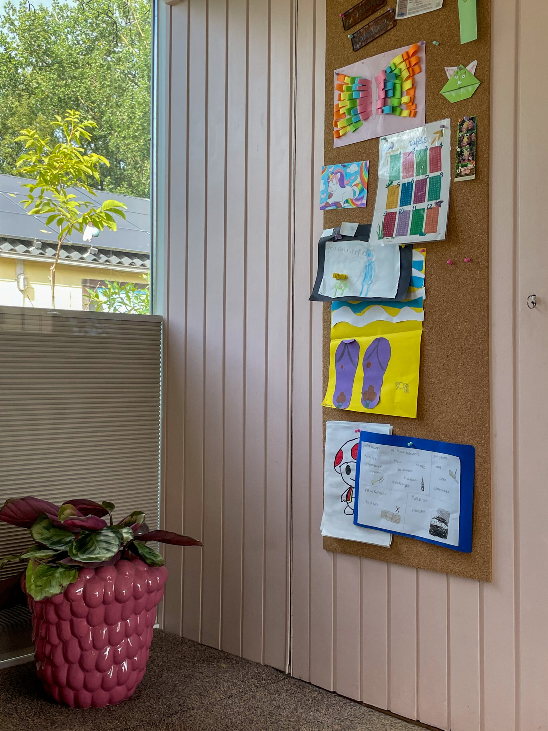 De creatieve kinderen hebben expositieruimte gekregen op de deuren. Op de kurken panelen kunnen ze naar hartenlust hun kunstwerken tentoonstellen. Om deze nog beter tot zijn recht te laten komen hebben we de achtergrond (de schrootjeswand en de deuren) geschilderd in de lichtroze kleur die ook op andere plekken in de woonkamer terugkomt.