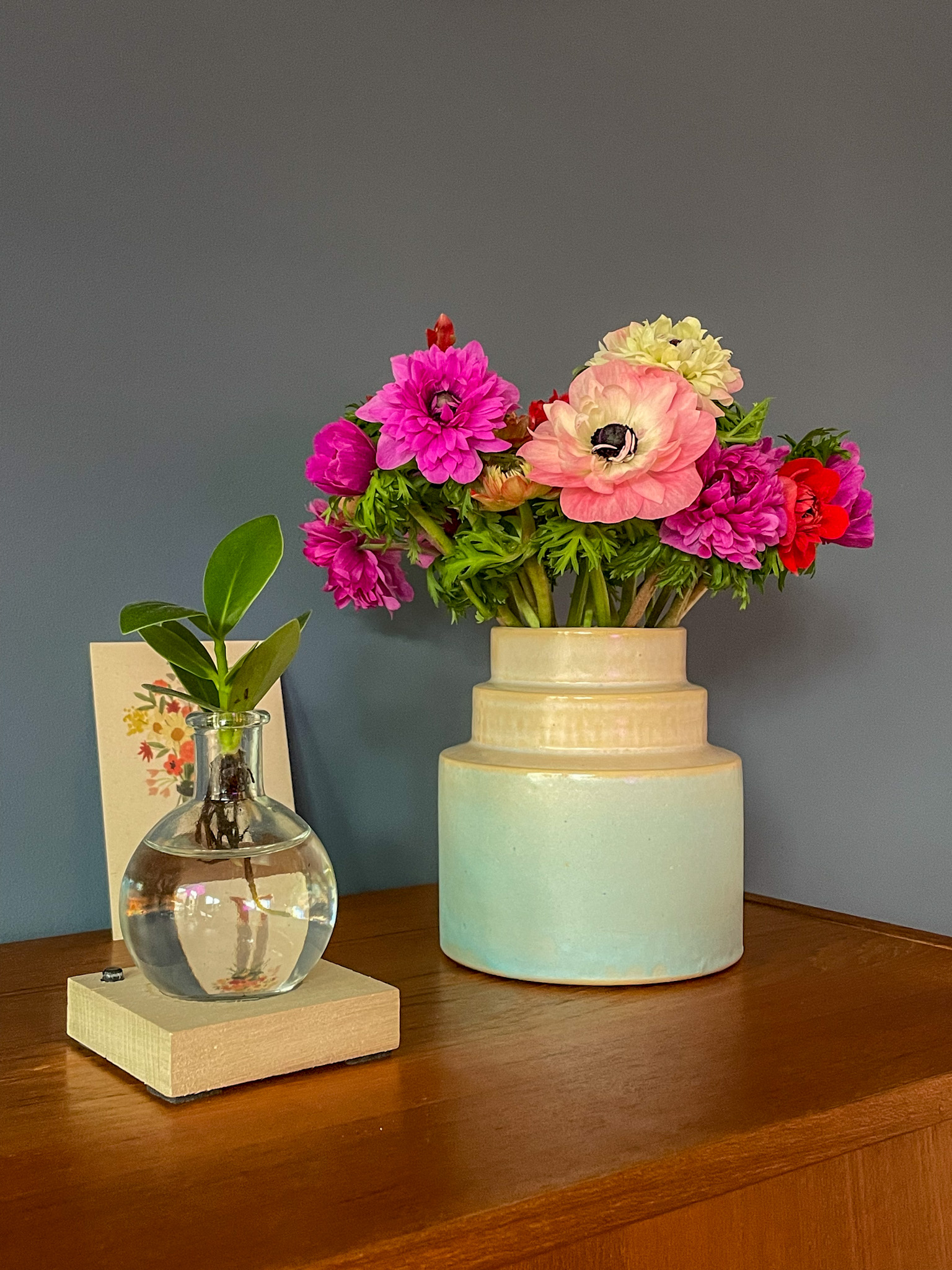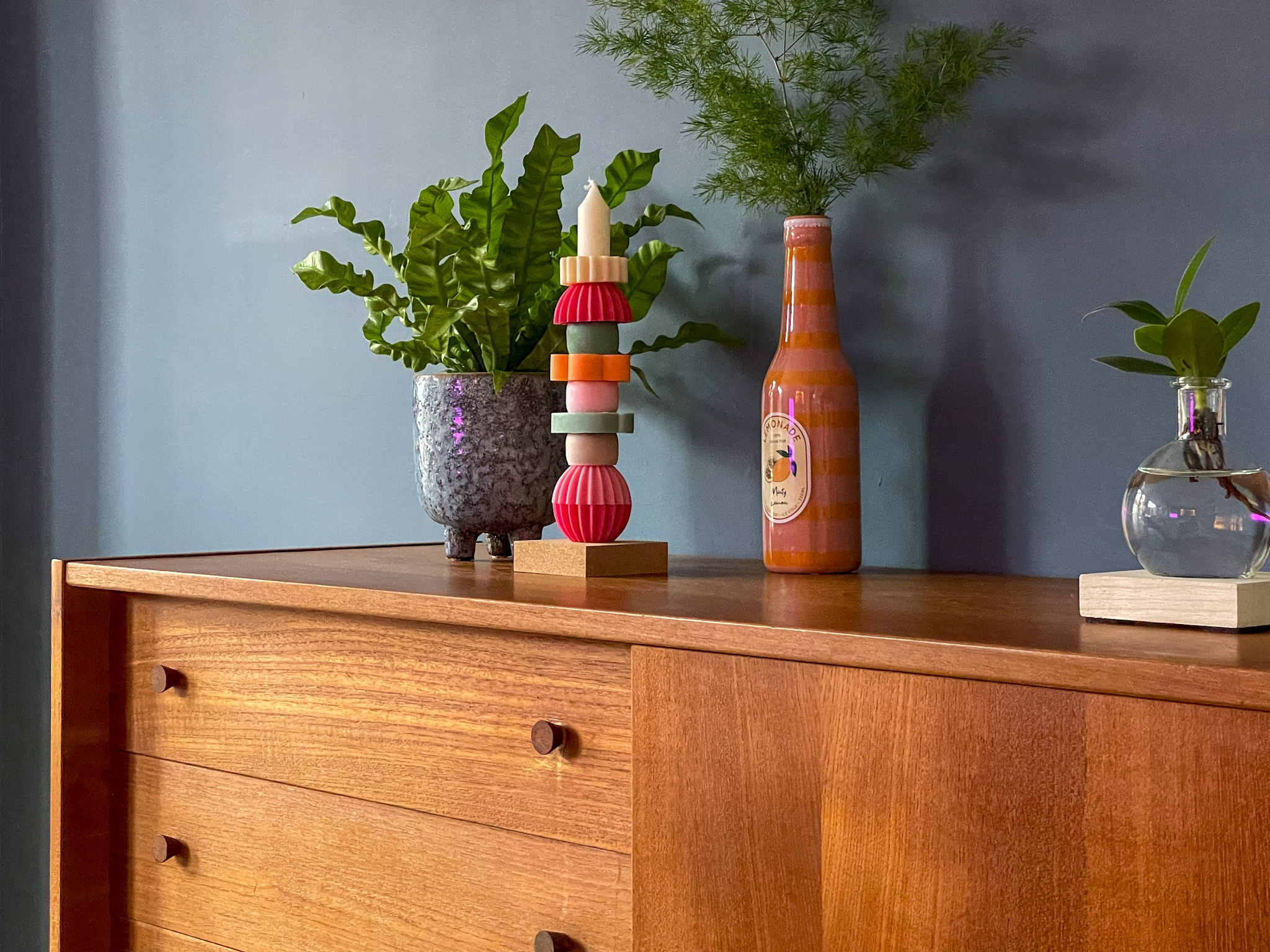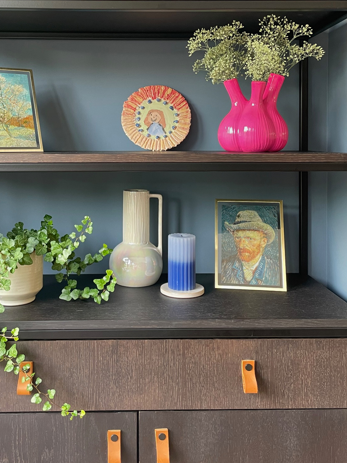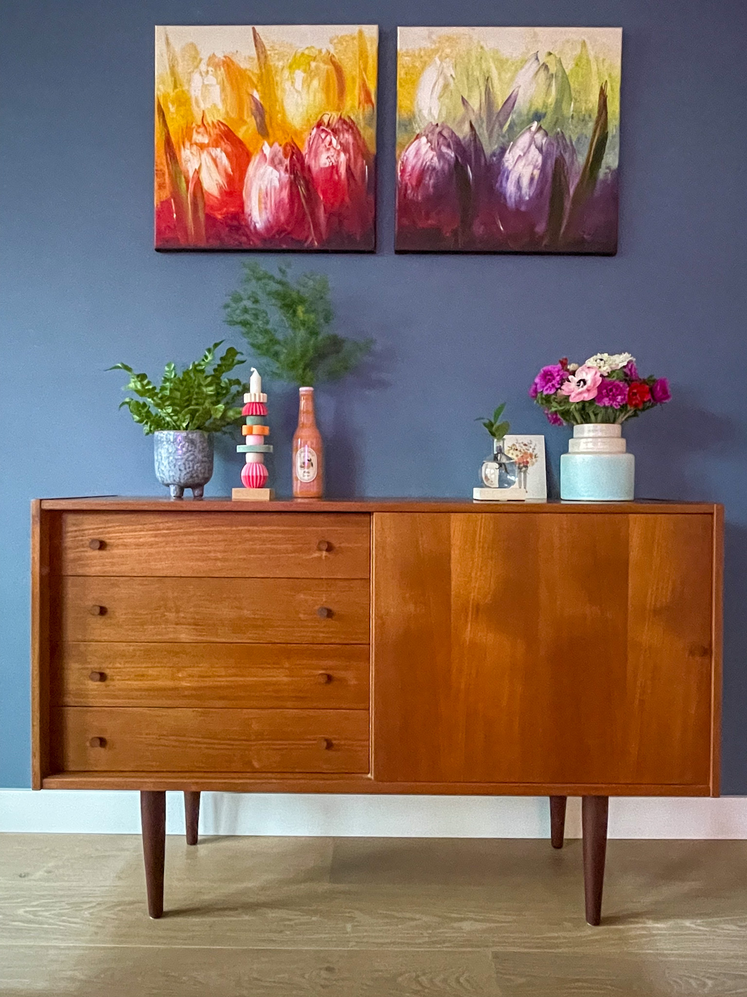 In de speelhoek hebben we de opslag van de spelletjes, boeken en tekenspullen verstopt achter de kastdeurtjes. Zo is het makkelijk bereikbaar voor de kinderen en kunnen wij als ouders genieten van de looks van het Deens vintage kastje en onze gezellige woonaccessoires, kunst en de creaties van de kinderen.