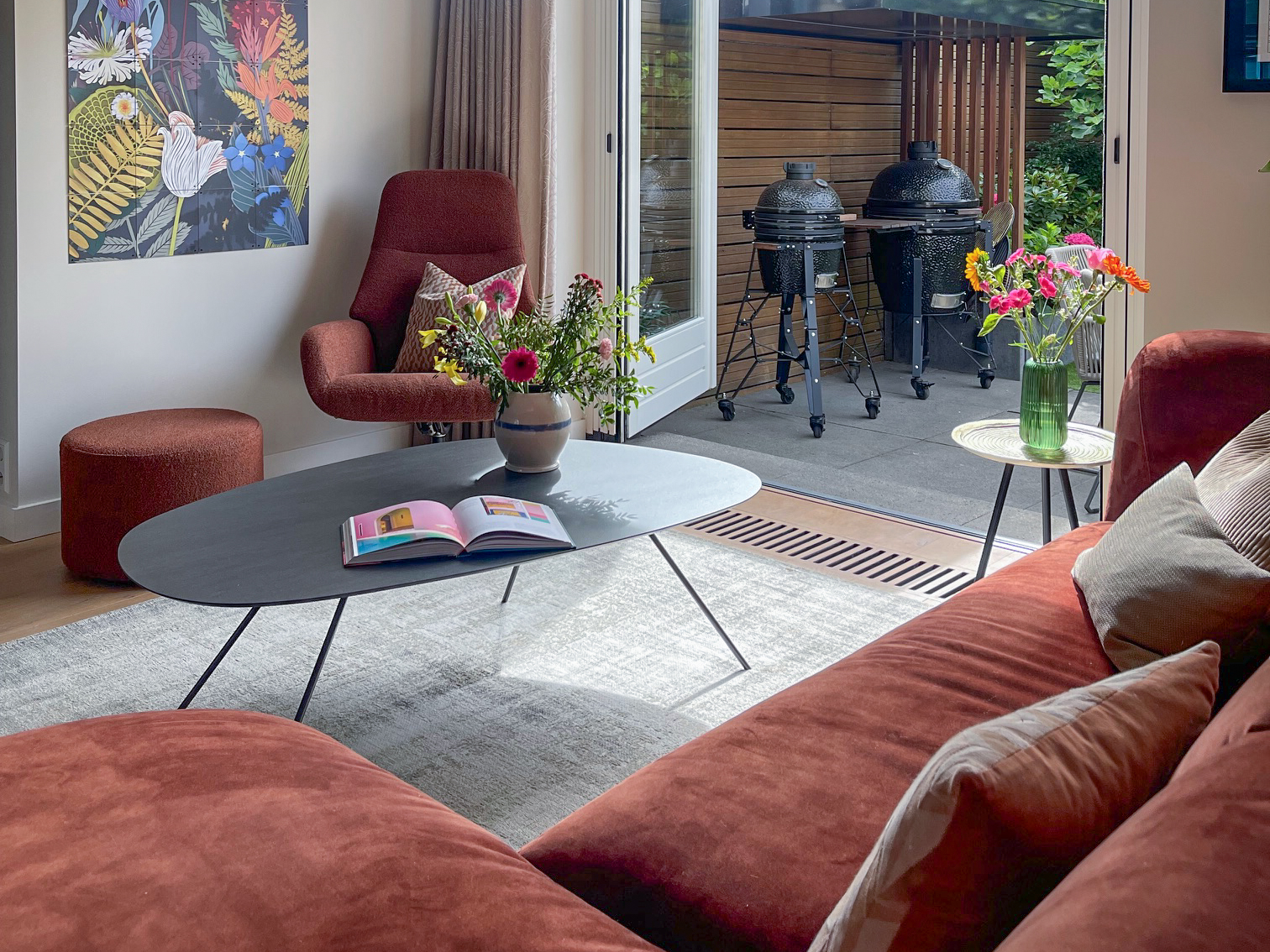 De zithoek hebben we omgedraaid, zodat de speelhoek ’s avonds uit het zicht is. Dit zorgt voor veel rust in de ruimte en dus ook in ons hoofd. De afgeronde vormen in de meubels creëren eenheid. Het vloerkleed, dat qua vorm terugkomt in het verlaagde plafond, verbindt de zithoek tot een gezellig ziteiland.